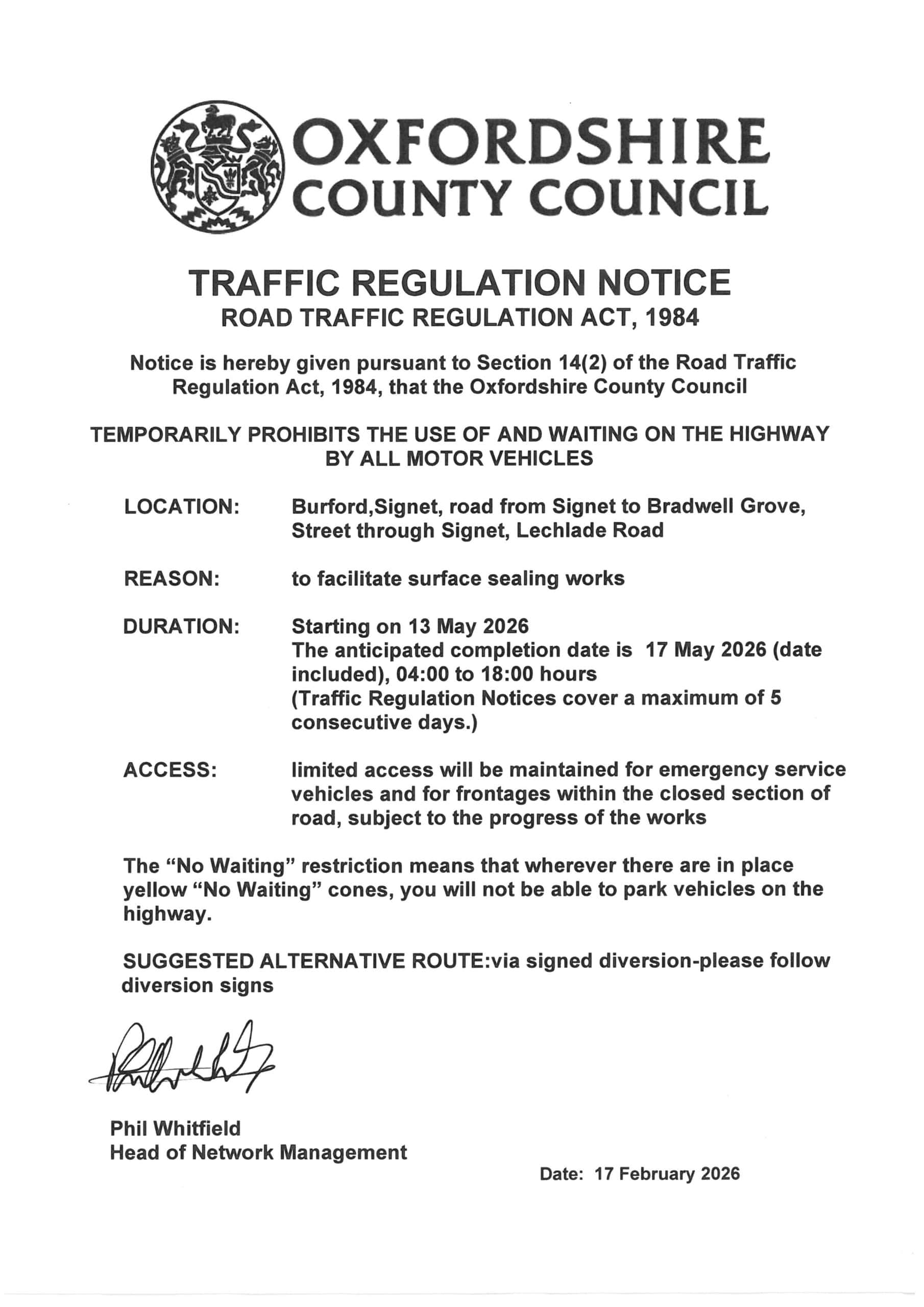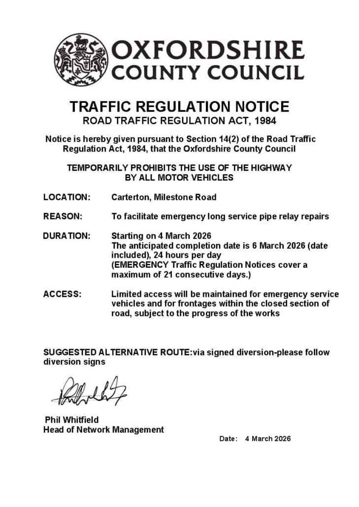 Town Survey Poster 2026TRAFFIC REGULATION NOTICE – CARTERTON, MONAHAN WAY & ROAD FROM MONAHAN WAY TO MINSTER ROAD ROUNDABOUT