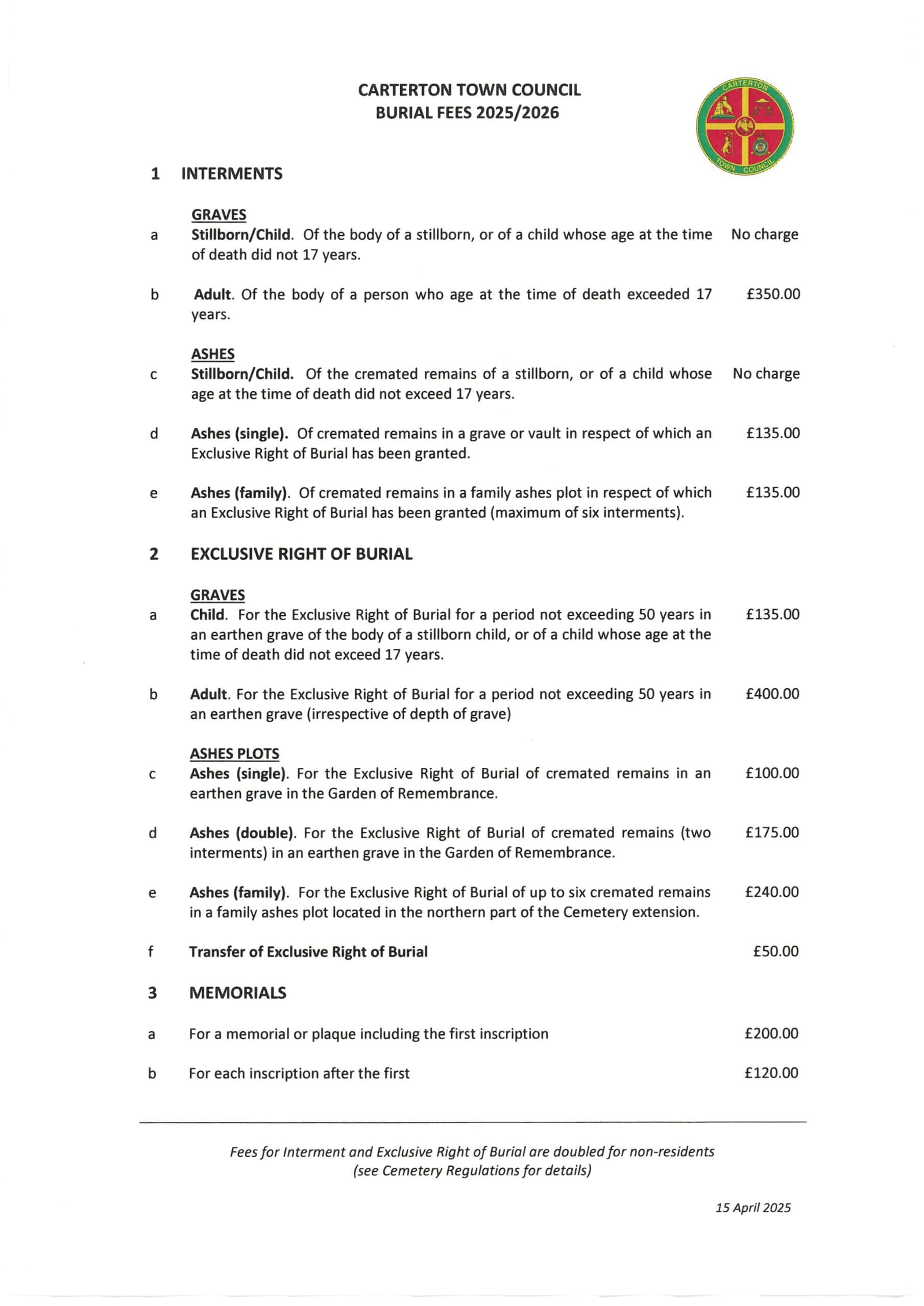 The Exclusive Right of Burial (EROB) for a grave or ashes plot can be purchased for a period of 50 years and entitles the owner to place a memorial stone on the grave and to be buried in the plot themselves in the future (space permitting). It can be transferred to another person by a legal process on application to the Town Council. The holder of the EROB is required to give their permission before a grave can be reopened or a memorial erected.
