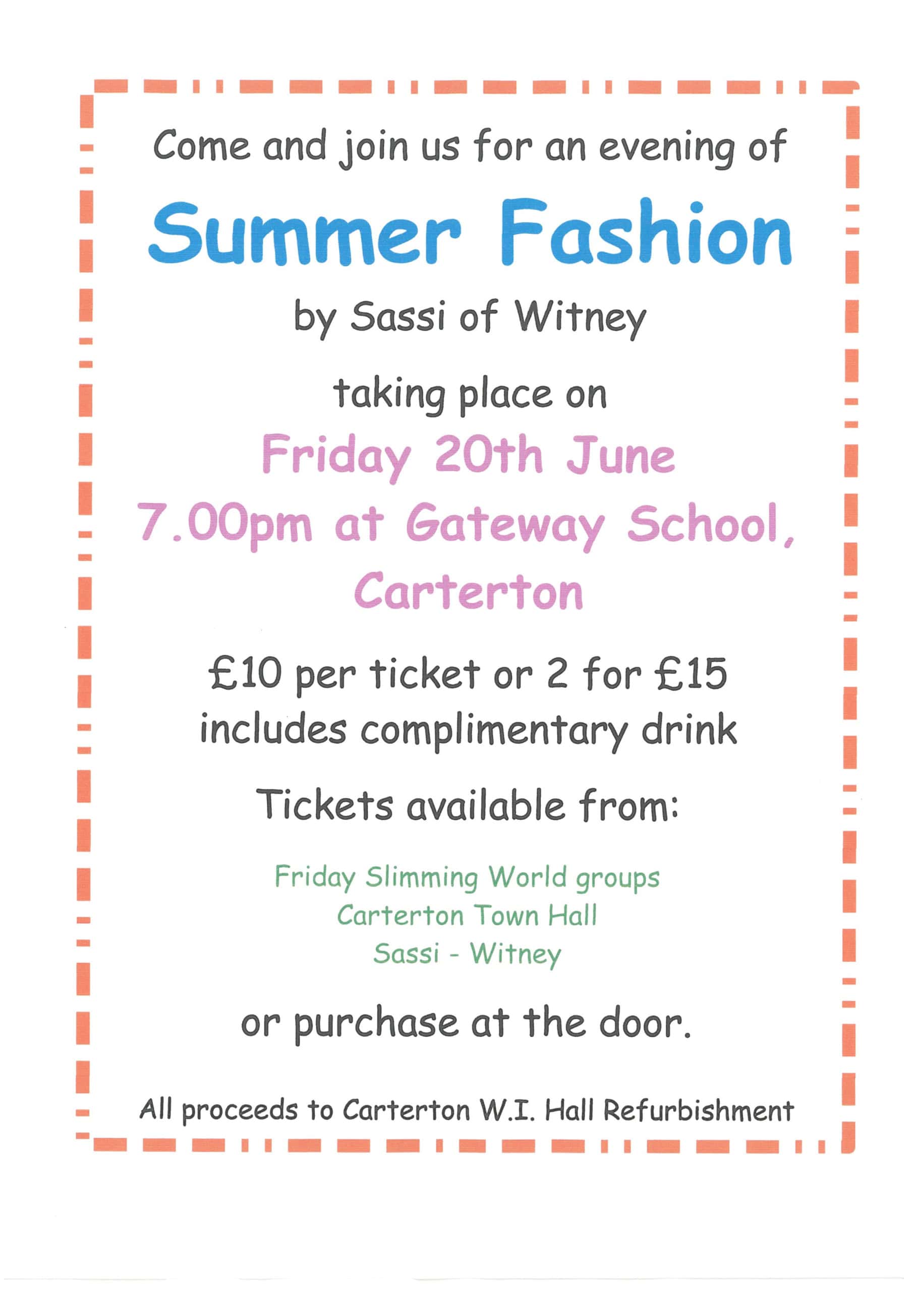 All proceeds to Carterton WI Hall Refurbishment. Friday 20th June at Gateway School, Carterton