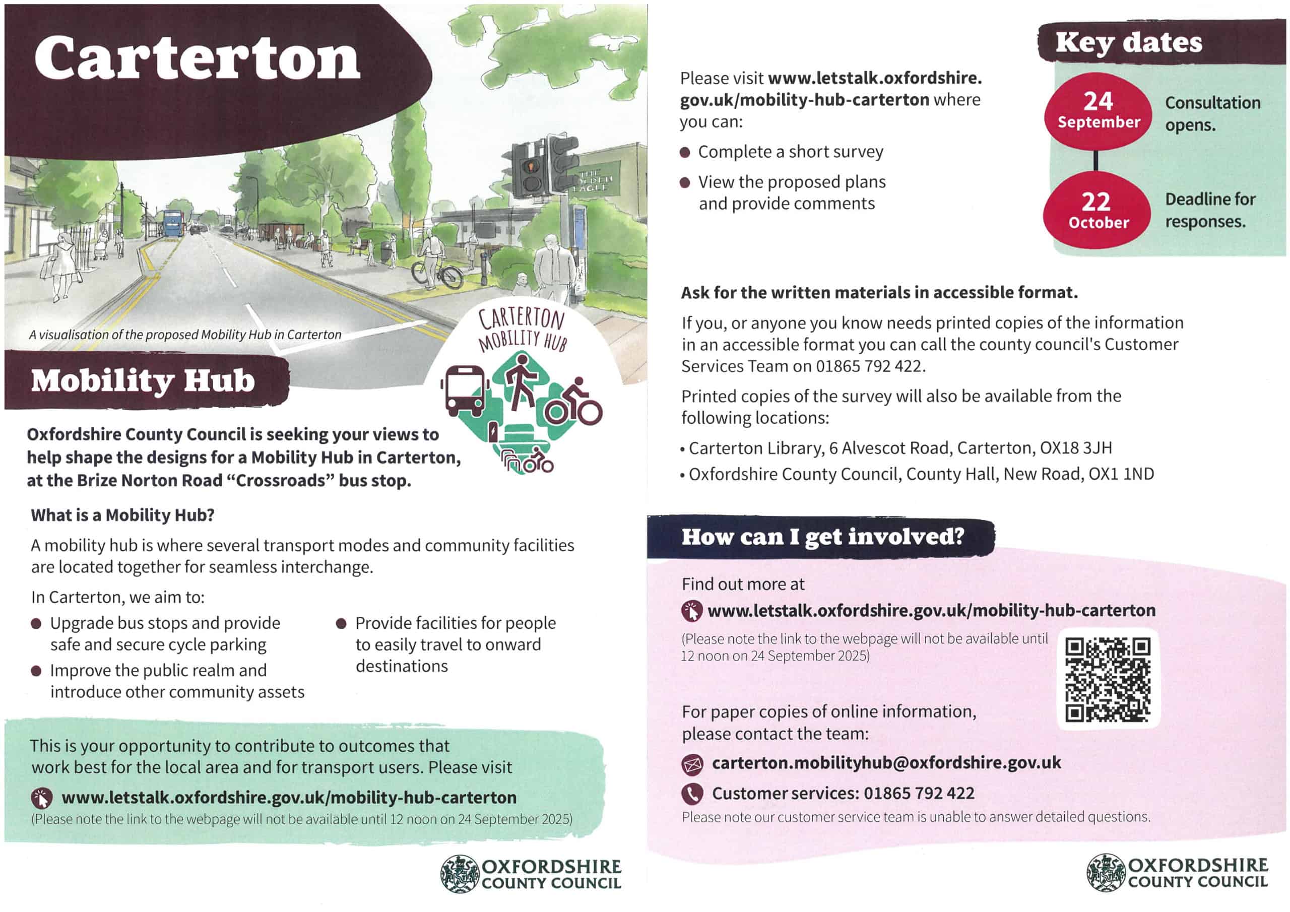 Oxfordshire County Council is seeking your views to help shape the designs for a Mobility Hub in Carterton. Please see details below.