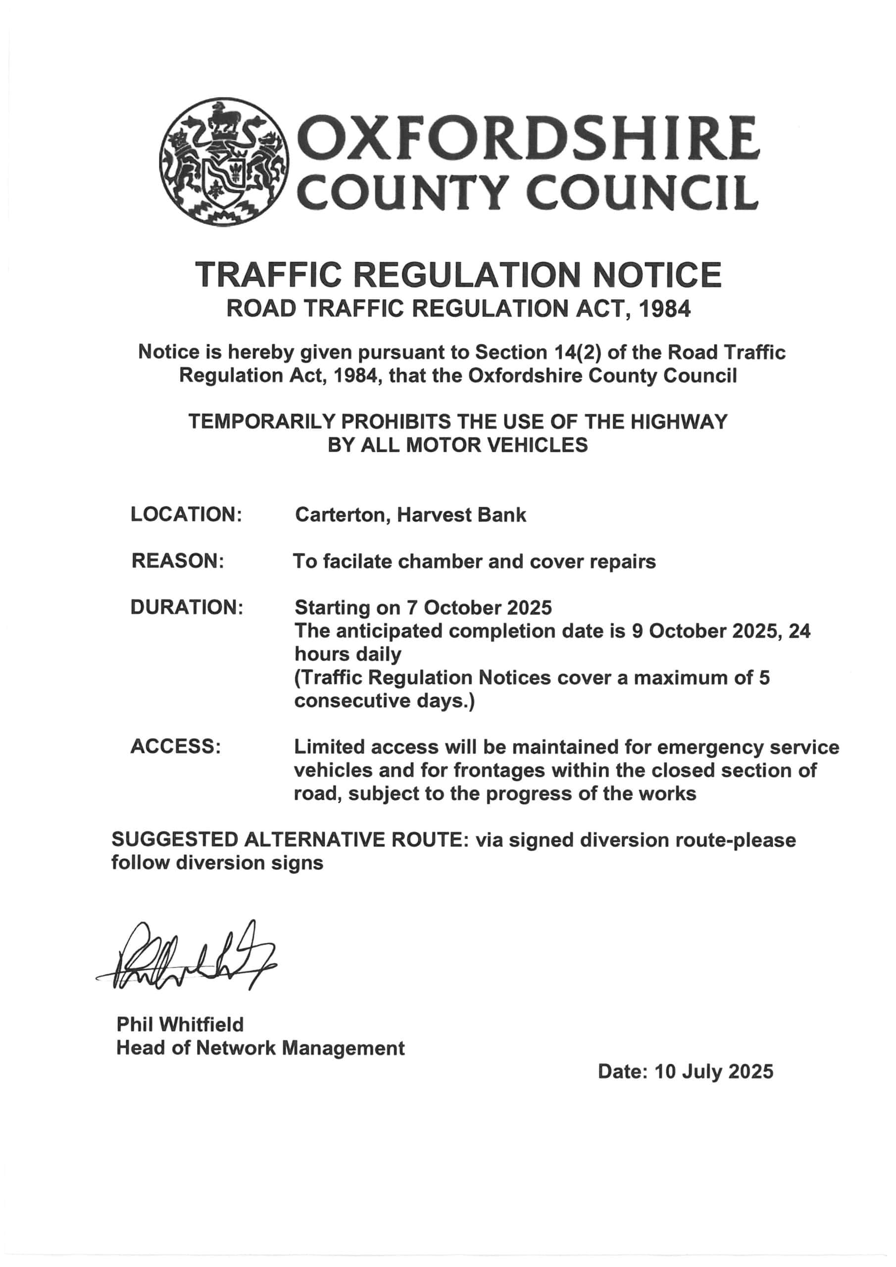 TRAFFIC REGULATION NOTICE – CARTERTON, HARVEST BANK